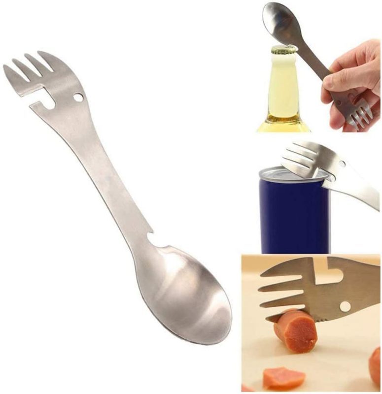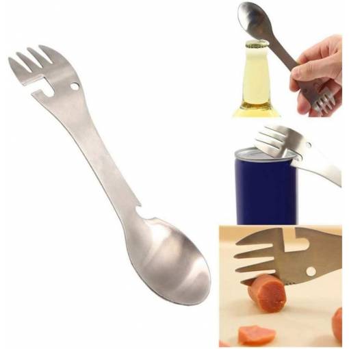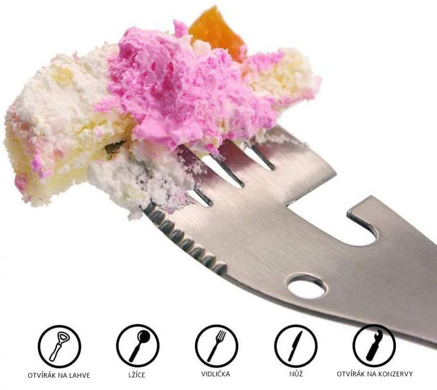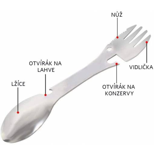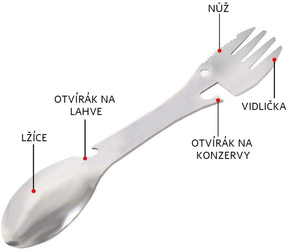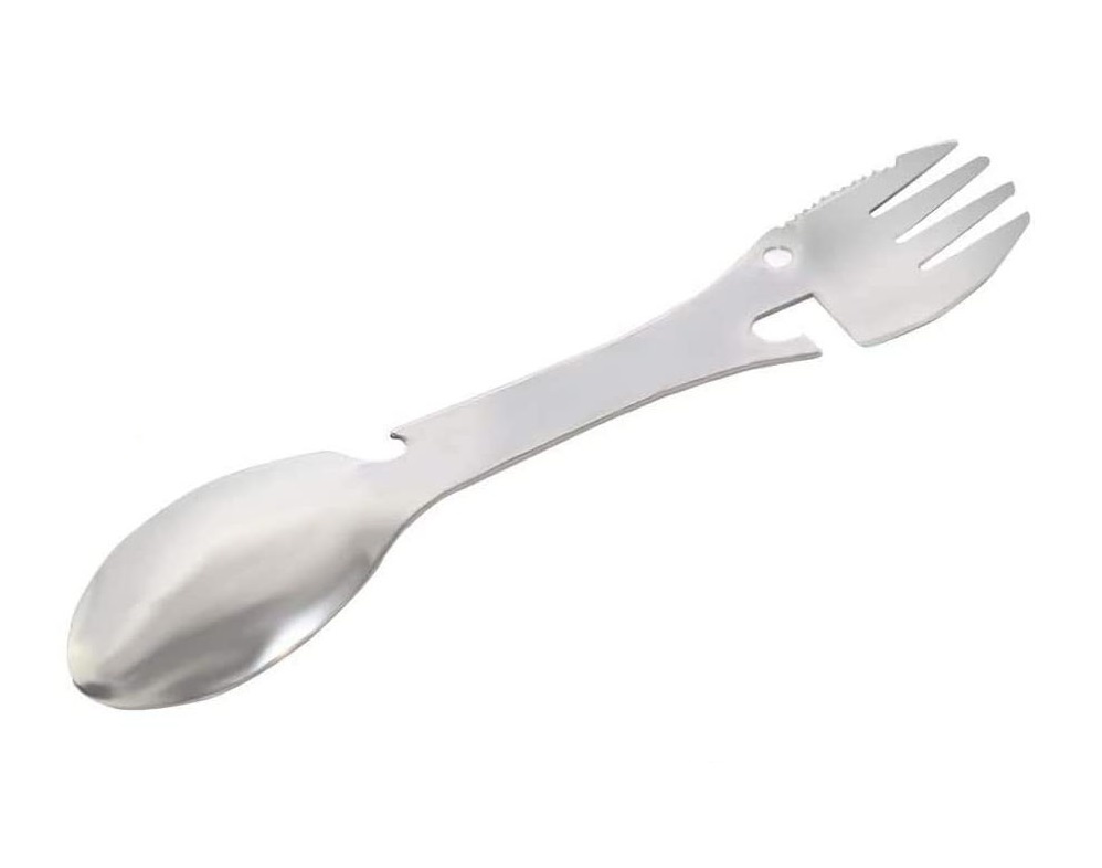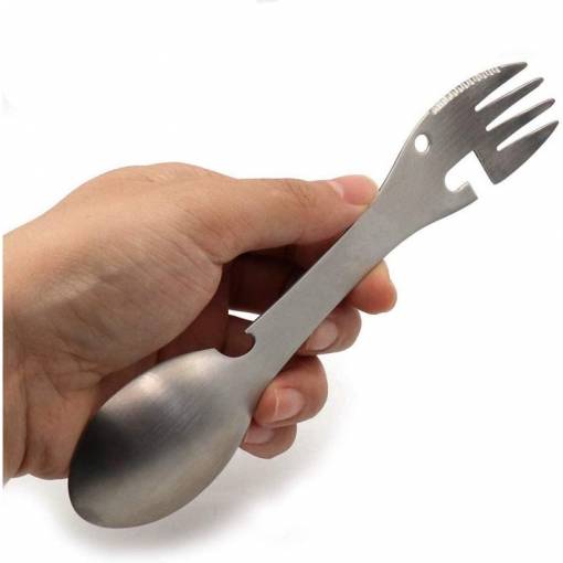 Tăișul multifuncțional, care înlocuiește complet lingura, furculița, cuțitul, deschizătorul de sticle și de conserve.