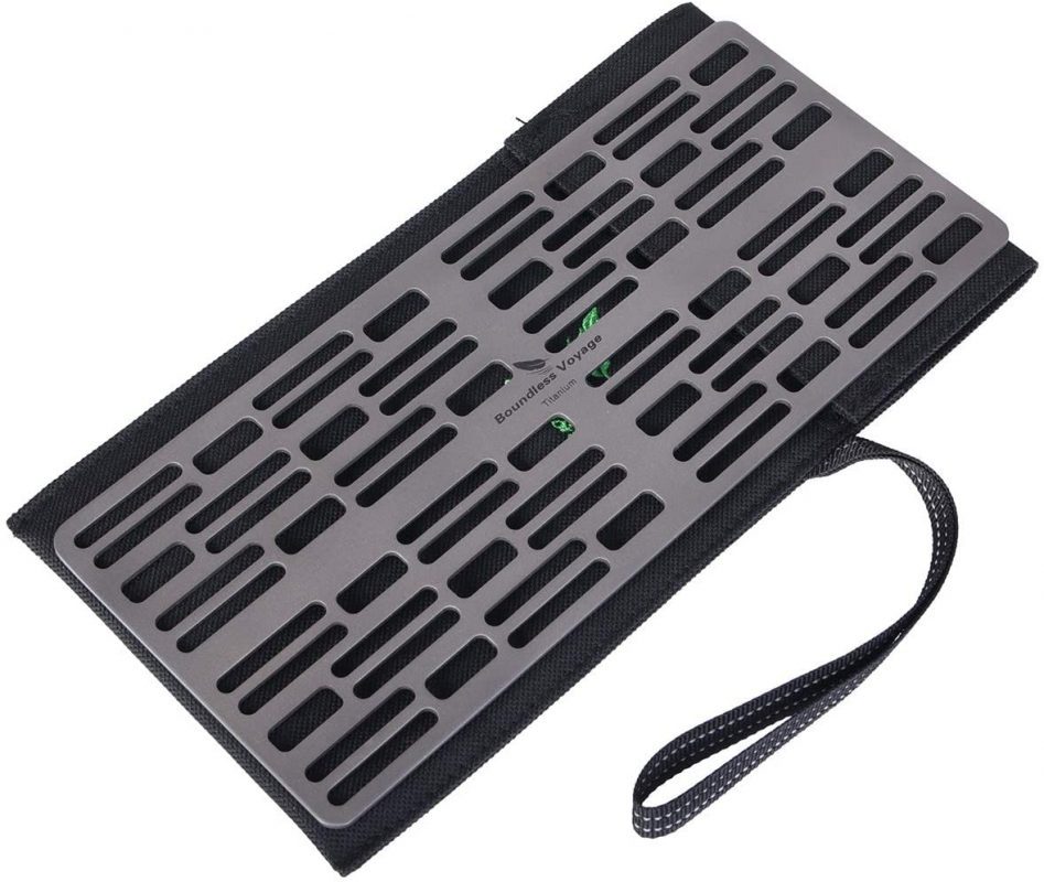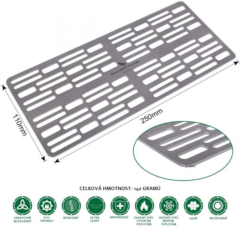 Ușor și portabil: grătarul măsoară 250 x 110 mm, grosimea sa este de 2 mm și cântărește doar 142 grame. A fost dezvoltat special pentru experți în bushcraft și camping de expediție.
