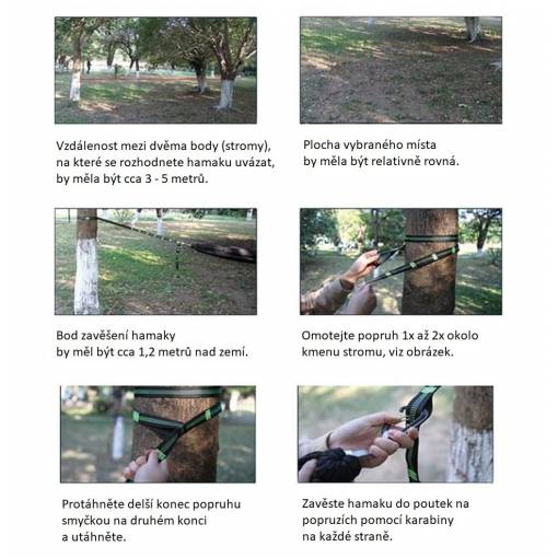 Hamaca este livrată cu două carabine solide și sfori din nylon pentru suspendare.