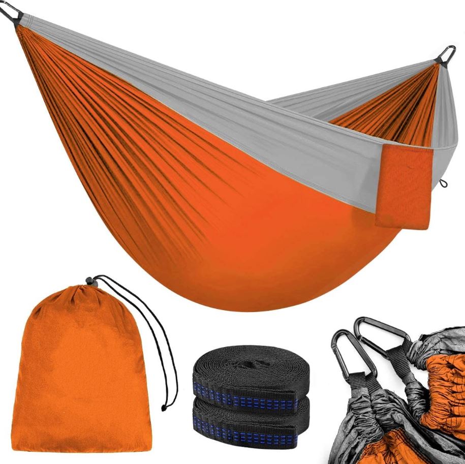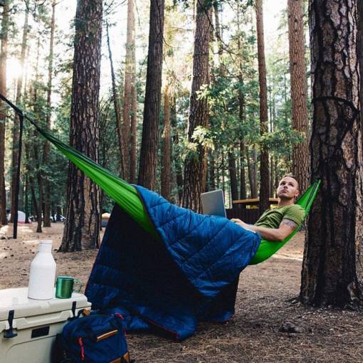 O hamacă compactă, care se agăță ușor între două puncte fixe, de obicei copaci, oferind o alternativă confortabilă pentru dormit în natură.