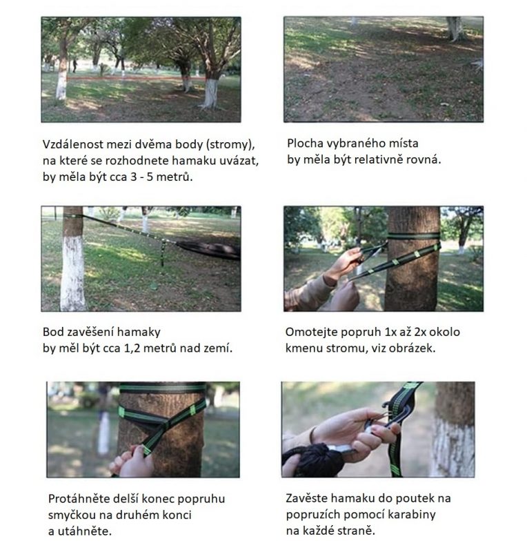 Hamaca este livrată cu două carabine solide și sfori din nylon pentru suspendare.