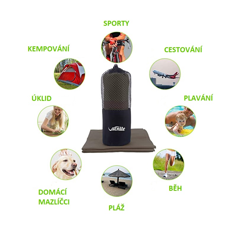 Prosopul mare cu dimensiunile de 150 x 74 cm și prosopul mic cu dimensiunile de 80 x 38 cm sunt de până la 4 ori mai mici la împachetare decât prosopul clasic de aceeași dimensiune și usucă de până la 10 ori mai repede.