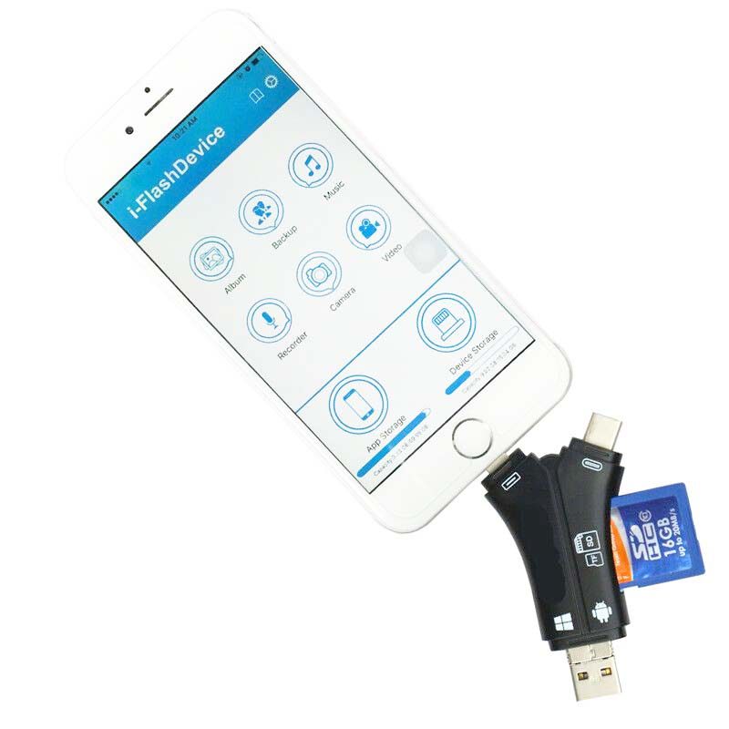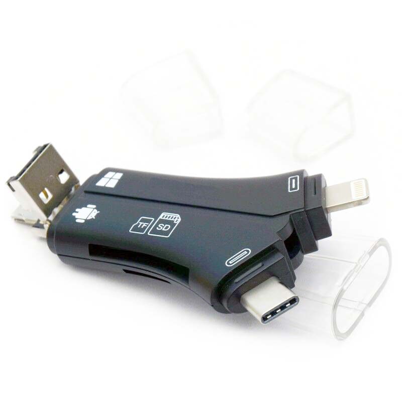 Cititor de carduri SD și TF, cititor de carduri 4 în 1 cu cititor de carduri SD (Lightning USB + Tip C + memorie micro SD TF + Micro USB B)