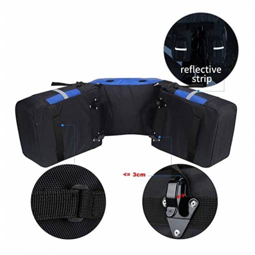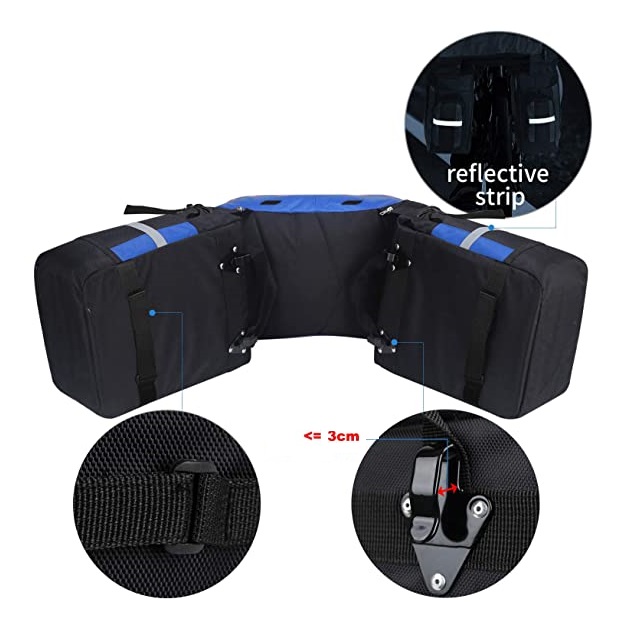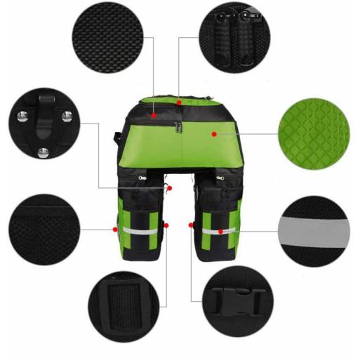 Fiecare dintre gențile laterale are două cârlige care servesc la prinderea pe suportul din spate al bicicletei, și o curea cu arici pentru fixarea pe laturile genții.