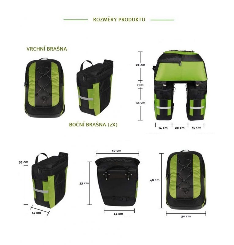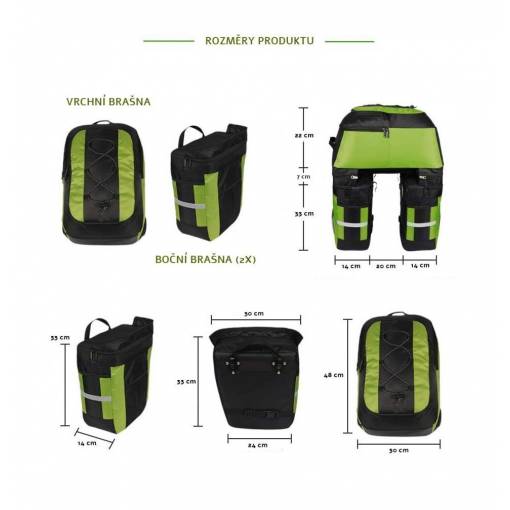 Pachetul conține o geantă 3 în 1 pentru suportul din spate al bicicletei + o folie neon galbenă pentru geantă.