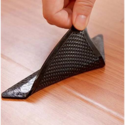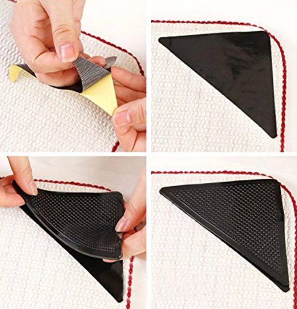 Pentru a le aplica, lipiți mai întâi autocolantele în cele patru colțuri ale covorului, apoi lipiți covorașele de silicon pe ele.