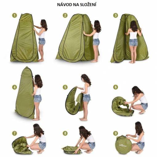 Pentru utilizarea la duș, cortul are deschidere cu fermoar pe partea superioară și din spate, prin care se poate introduce dușul.