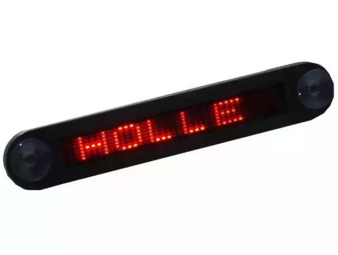 Panou LED auto programabil cu text în mișcare și telecomandă, acest afișaj este destinat instalării pe interiorul sticlei mașinii cu ajutorul unor ventuze.