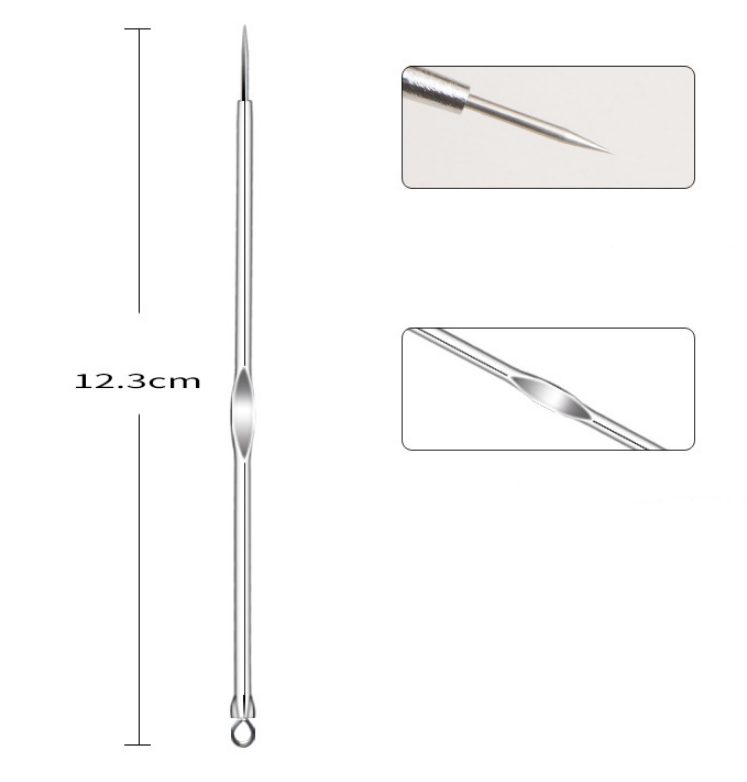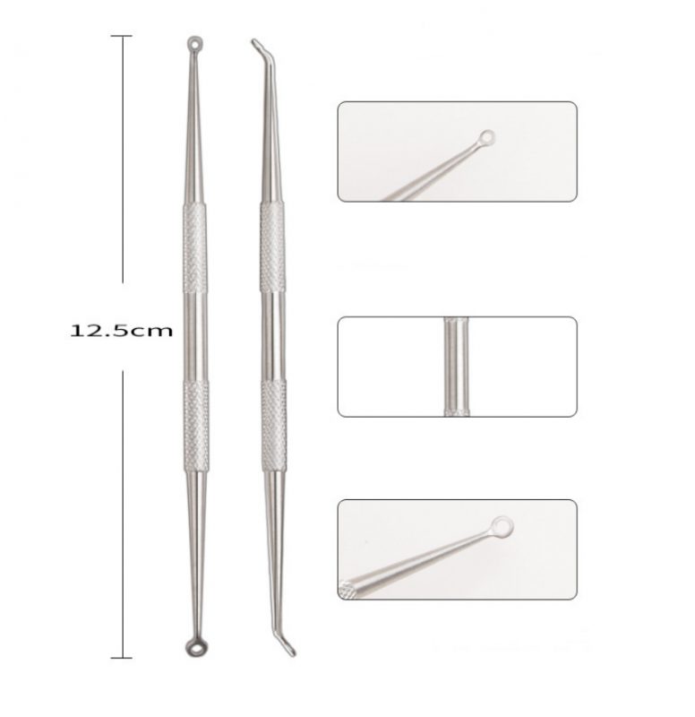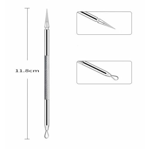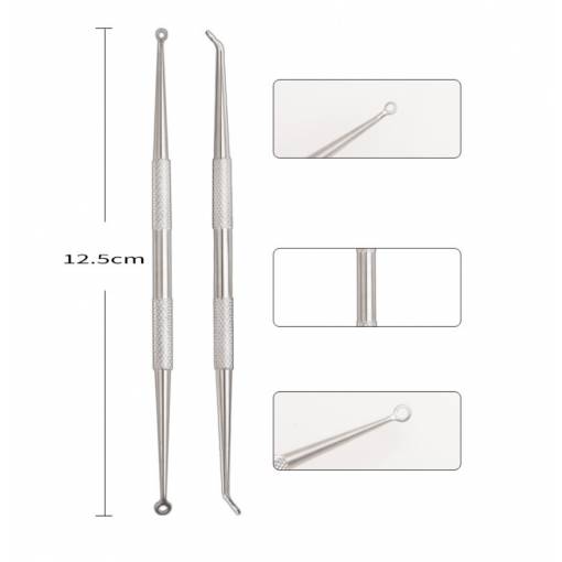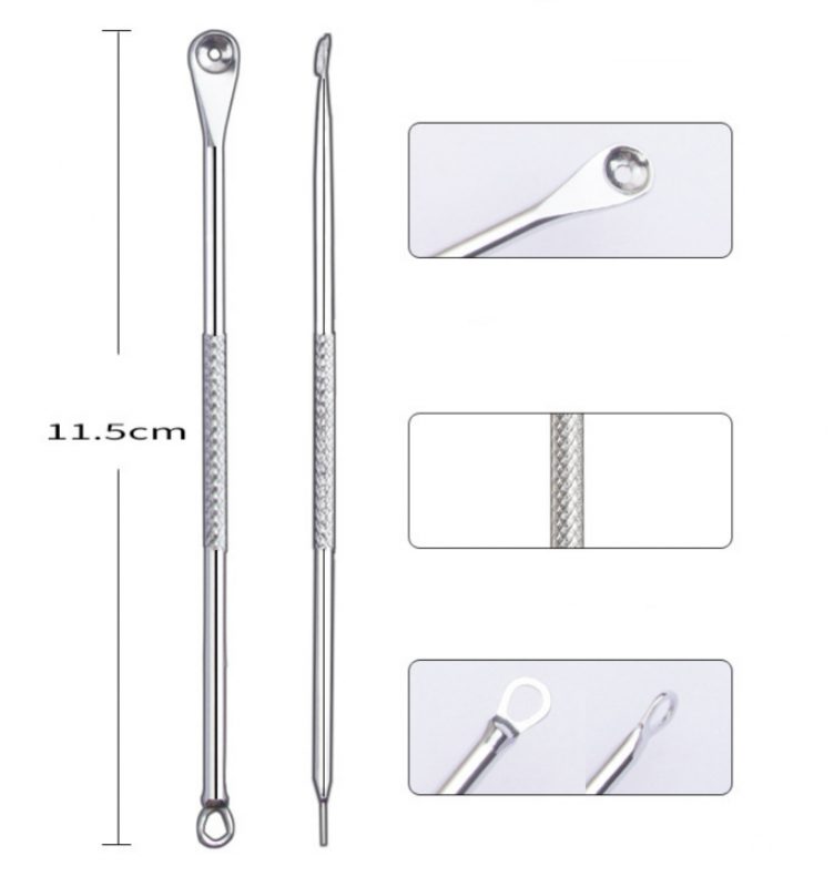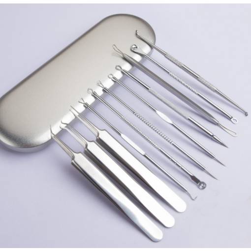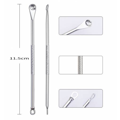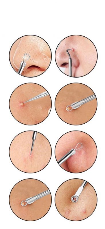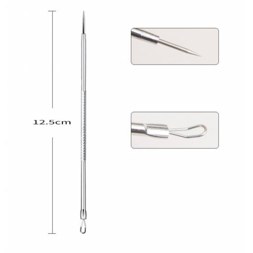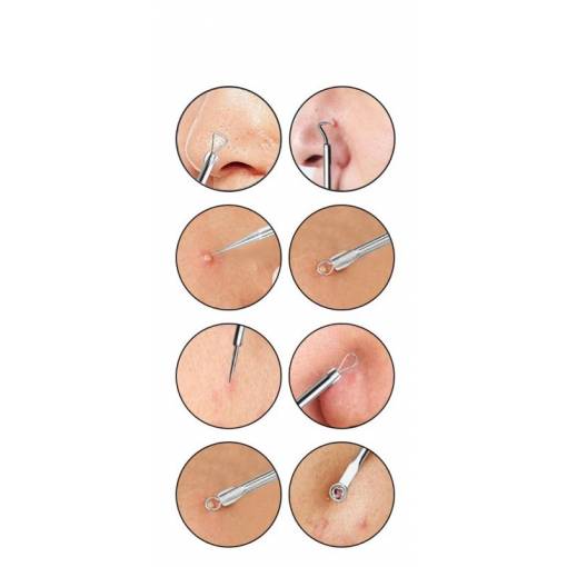 Setul conține ace, bucle, cârlige pentru pensetă, un cârlig simplu și pensetă ascuțită, care sunt folosite pentru a elimina leziunea acneică, coșurile și comedoanele.