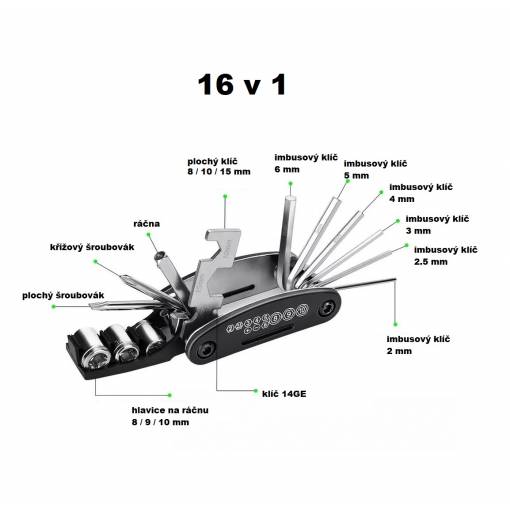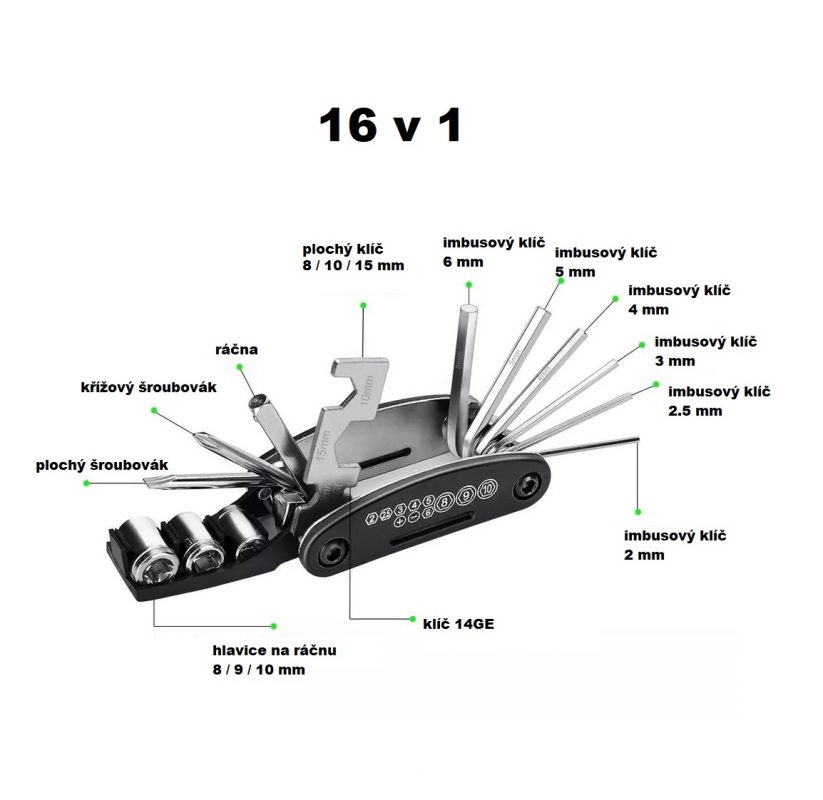 Plecați fără griji într-o excursie pe bicicletă cu acest instrument multifuncțional pliabil 16v1, care include: