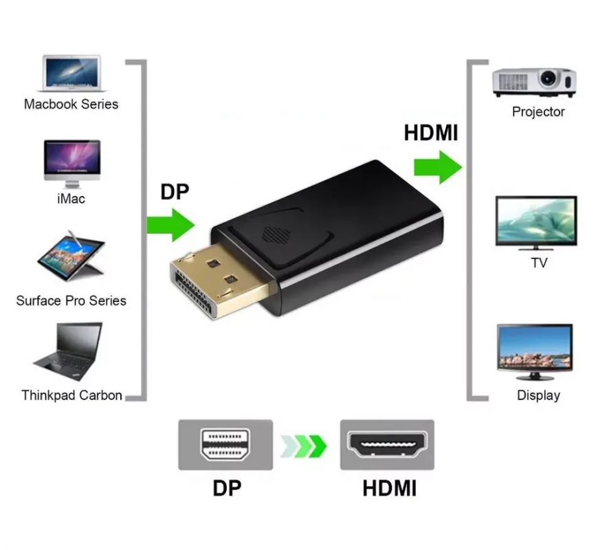 Atenție: transferul este unidirecțional DisplayPort => HDMI, conectorul DisplayPort conectează semnalul de intrare, conectorul HDMI conectează display-ul!