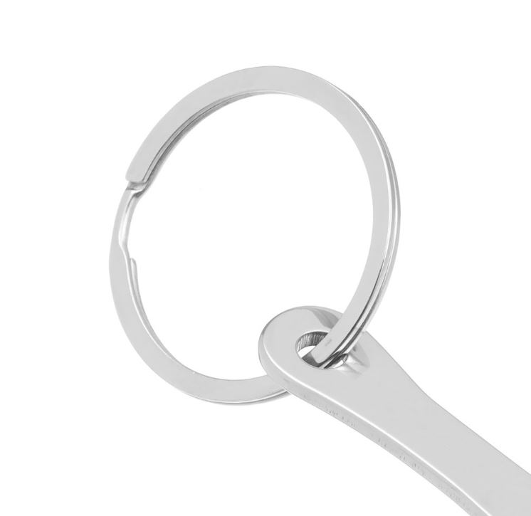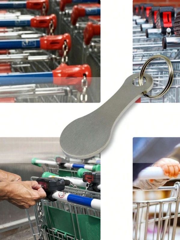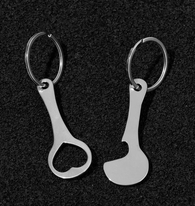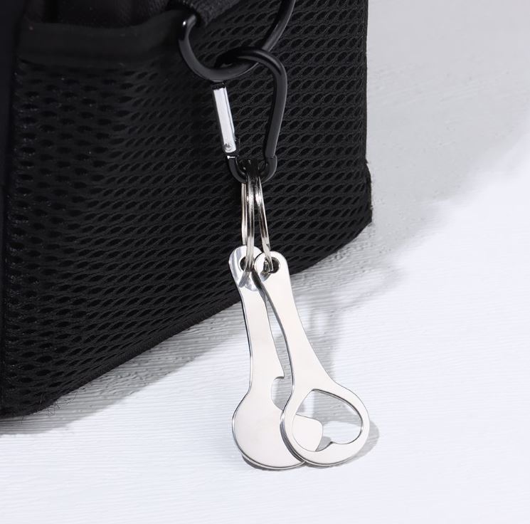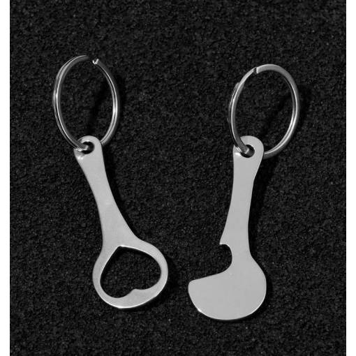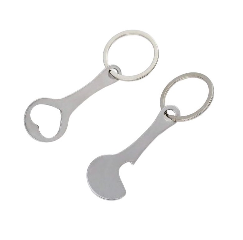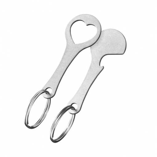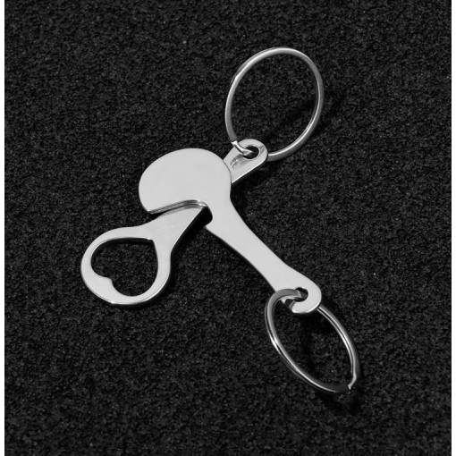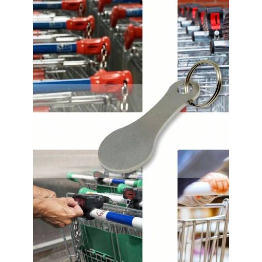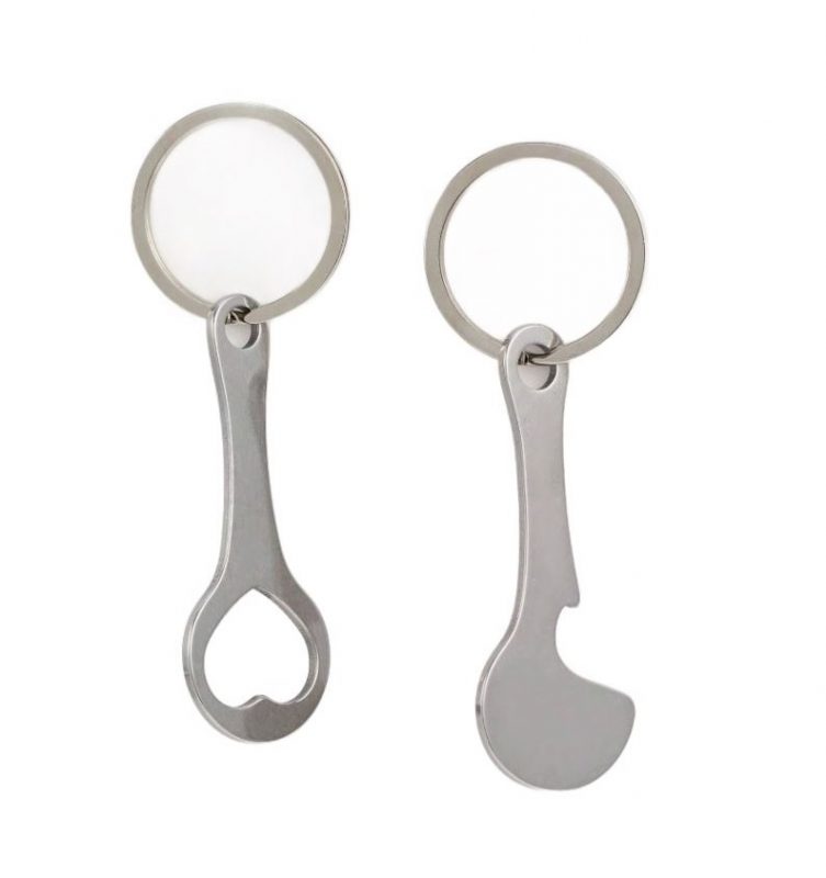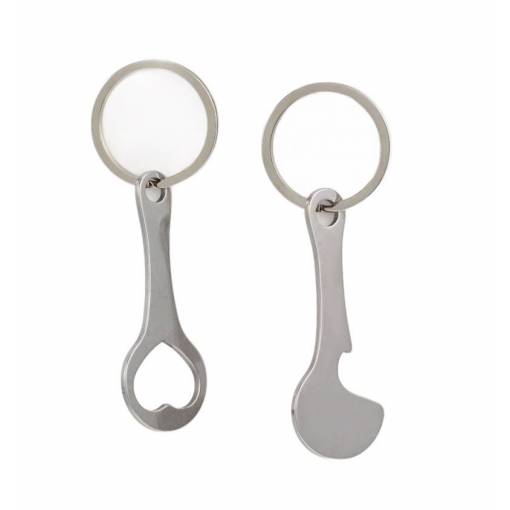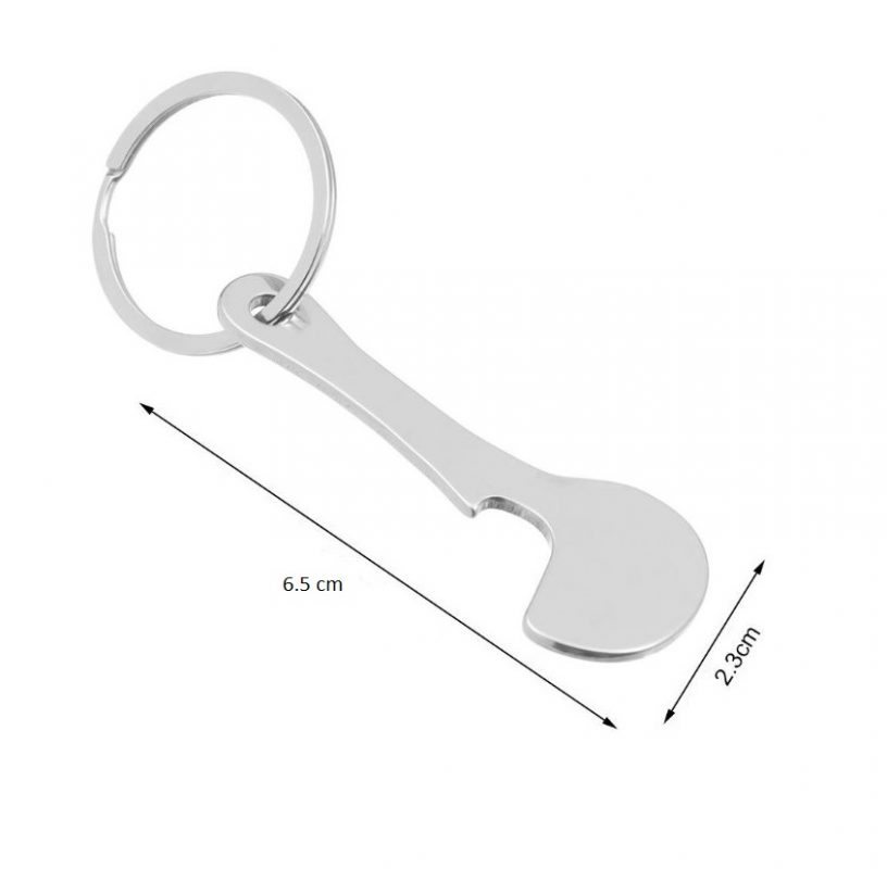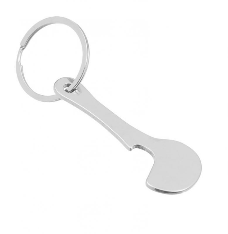 Set de două agățători metalice cu deschizător de sticle și jeton pentru cărucioare de cumpărături. Se prind cu ușurință de chei, fermoar, rucsac sau geantă.