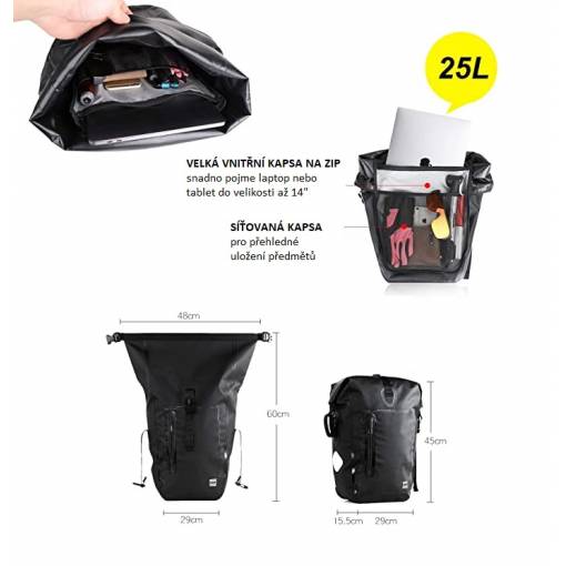Capacitatea de 25 litri oferă suficient spațiu pentru a depozita toate lucrurile esențiale, fie că plecați în excursie, la lucru sau pentru cumpărături mai mici.