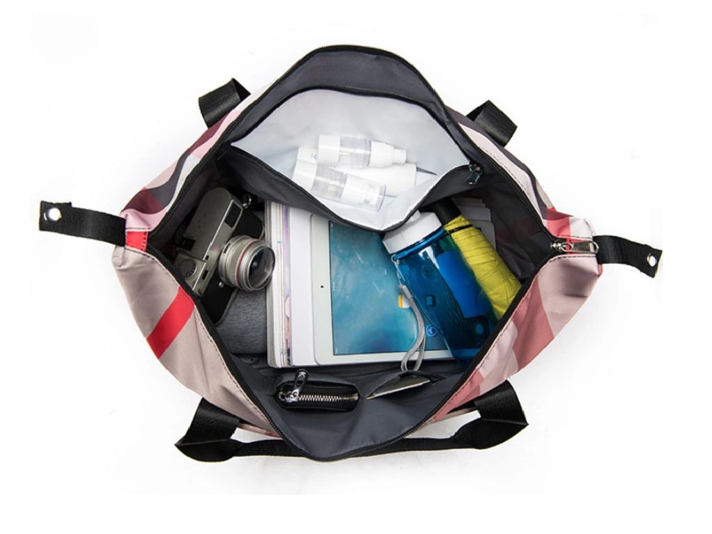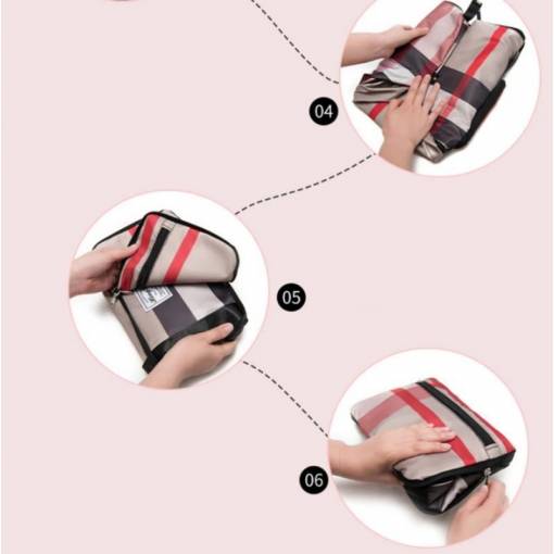 Puteți să o purtați în mână, pe umăr sau să o așezați pe valiză. Funcția de extindere este ascunsă în partea de jos a fermoarului, fără probleme puteți depozita ținute pentru călătorii de 3-5 zile.