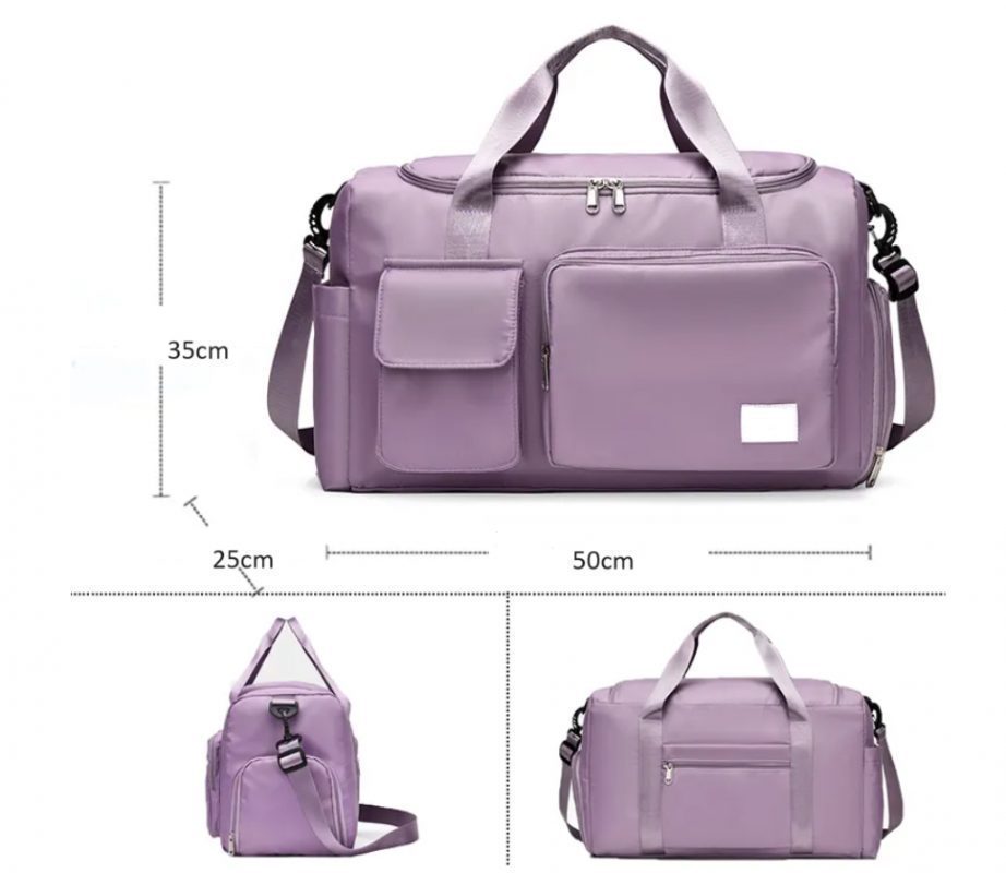 Geanta sportivă de călătorie poate fi purtată în mână, pe umăr sau prinsă de valiza pe roți, datorită curelei de umăr detașabile, care poate fi ajustată la lungimea dorită.