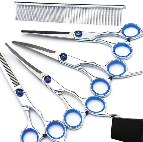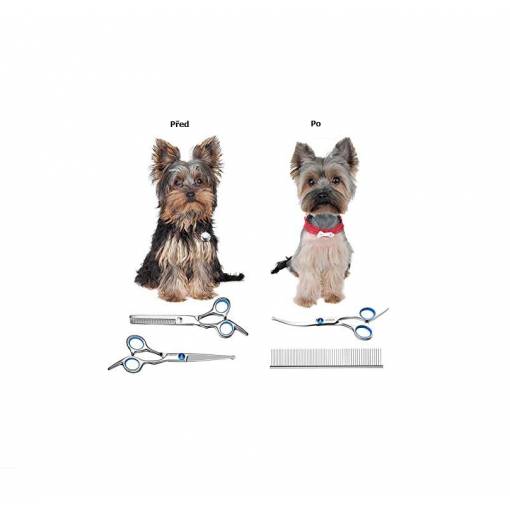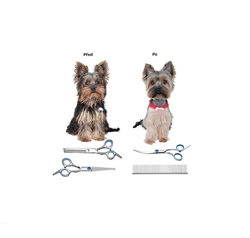 Setul pentru îngrijirea animalelor de companie conține: foarfece drepte, foarfece curbate în sus, foarfece cu vârfuri curbate în jos, foarfece de efilare, un pieptene drept, un sac pentru foarfece, o cârpă de curățat.