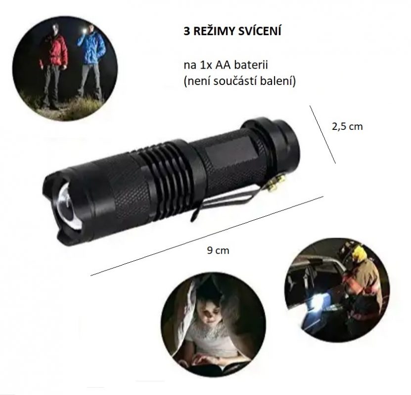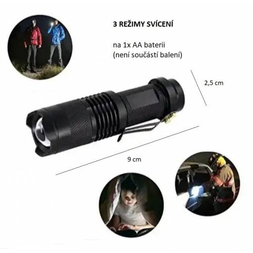 Lanternă: Trei moduri de iluminare (strălucitor, estompat, intermitent) într-un corp rezistent din aluminiu de dimensiuni 9 x 2,5 cm. Funcționează cu o baterie AA obișnuită.