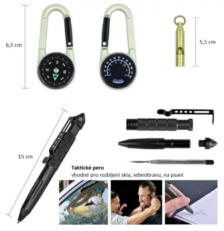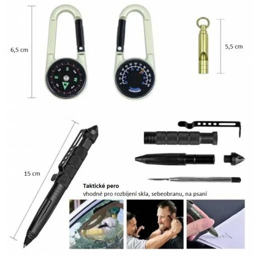 Setul de 9 unelte pentru supraviețuire într-o husă de plastic neagră conține toate lucrurile necesare pentru aventurile tale în natură.