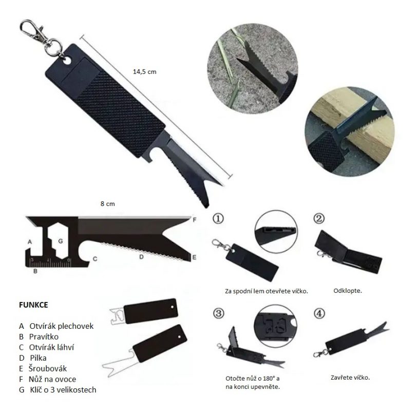 Această cartelă măsoară doar 7 x 4,5 cm, este ușoară și poate îndeplini rolul mai multor instrumente, cum ar fi cheile pentru piulițe și șuruburi de 6,7,8 și 10 mm, cheile pentru șuruburi plate, riglă, colțar, două găuri diferite, șurubelniță, feronerie și cuțit.