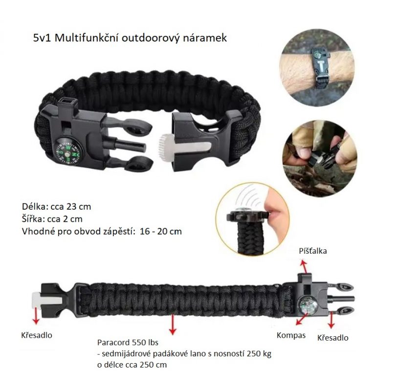 Împletit dintr-o sfoară de parașută cu 7 miezuri cu o capacitate de 250 kg, oferă o lungime de 2,5 m de sfoară rezistentă, care poate fi utilizată în caz de nevoie pentru a construi un adăpost, pentru coborâri de urgență sau ca șireturi de rezervă pentru pantofi. Brățara este conectată cu un clips de plastic, în care este încorporată un tranchilizat și un chibrit pentru aprinderea focului.
