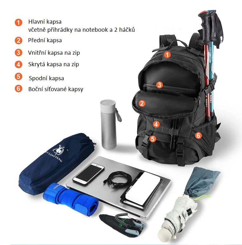 Spacious: Rucsacul are un compartiment mare cu fermoar ascuns dublu, un compartiment frontal mic cu fermoar, un compartiment în partea inferioară (cu ventilație și catarame) și două compartimente laterale din plasă. Compartimentul principal de mare capacitate poate acomoda formate A4, un laptop cu ecran de 17,3 inch sau echipamente pentru o excursie cu bicicleta sau pe jos.