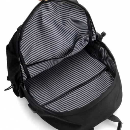 Port USB și curea pentru valiză: Pe partea dreaptă a rucsacului se află un port USB extern, unde puteți conecta o powerbank în interiorul rucsacului și să încărcați telefonul din exterior, în timp ce îl utilizați. Rucsacul oferă, de asemenea, o curea pentru fixarea pe mânerele unei valize.