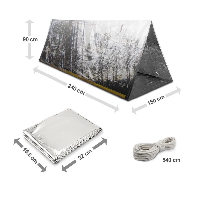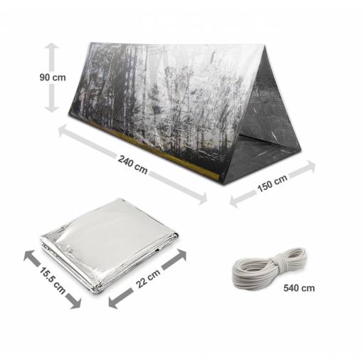 Ambalajul conține un cort de urgență și o frânghie pentru prindere.