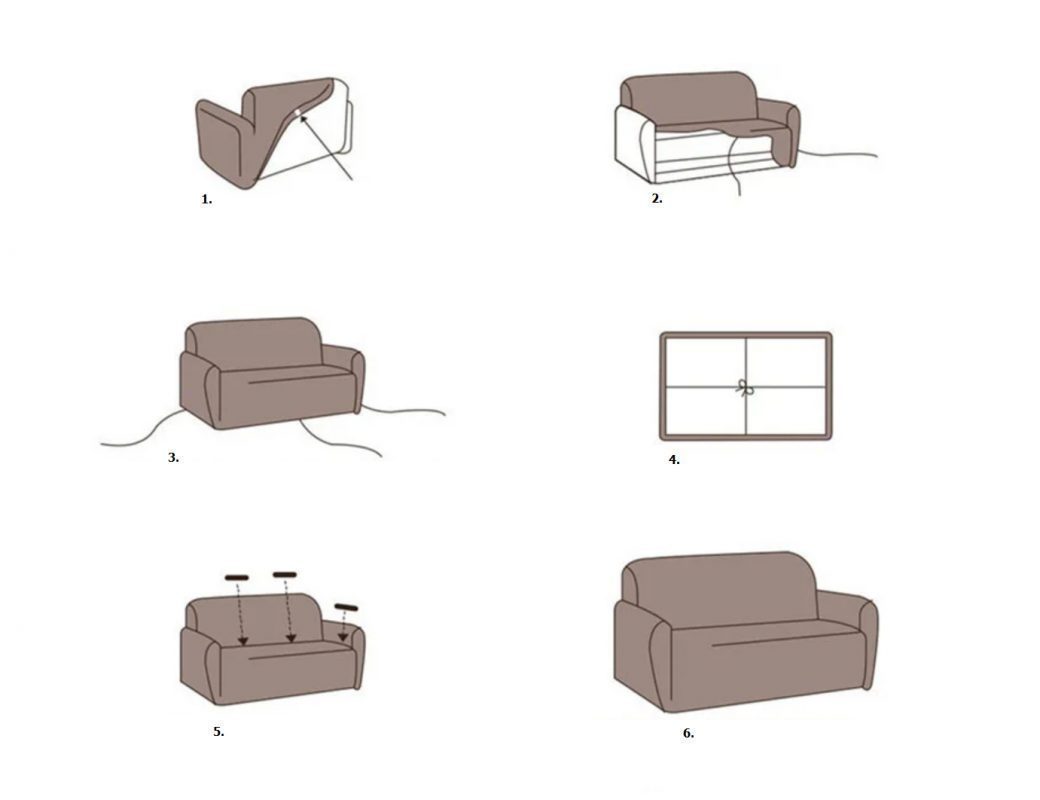 Utilizare: husa se întinde peste fotoliu, se fixează în spațiile dintre pernele canapelei cu rolele de polistiren și se asigură de partea inferioară a canapelei cu benzi.