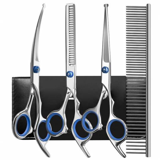 Setul pentru îngrijirea animalelor de companie conține: foarfece drepte, foarfece curbate în sus, foarfece curbate în jos, foarfece de tip efilat, pieptene drept, sac pentru foarfece, cârpă de șters.