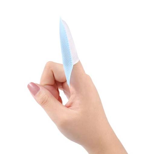 - Aplicați șervețelul pe degetul arătător cu partea lungă în interiorul palmei, iar partea scurtă acoperă unghia.