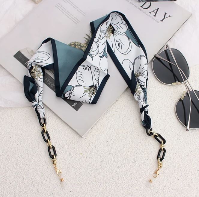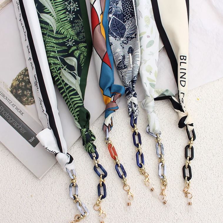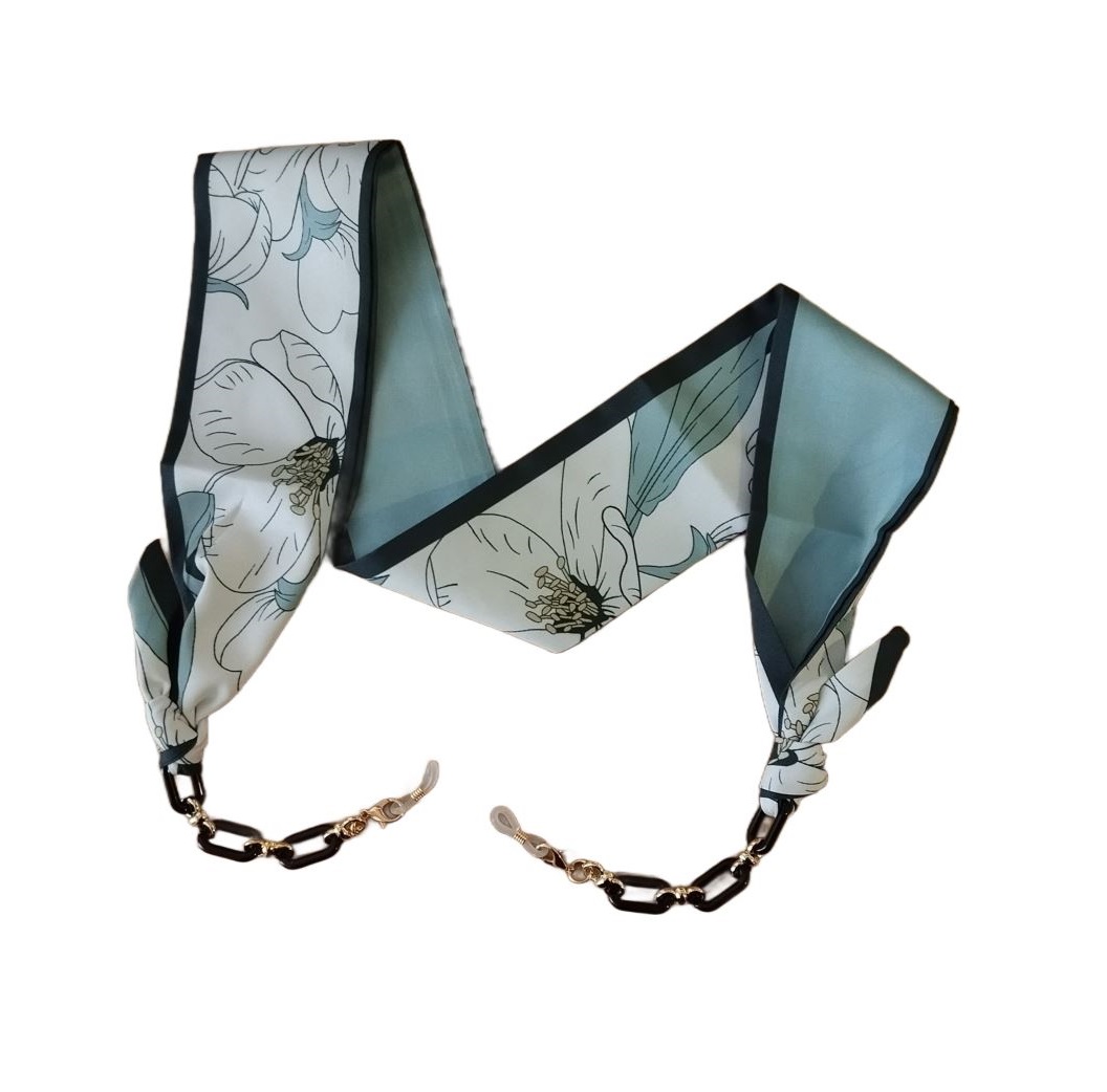 Eșarfa din mătase cu un lanț acrilic pentru suspendarea ochelarilor în jurul gâtului nu este doar practică, ci servește și ca un accessory de modă superb.