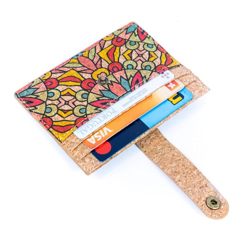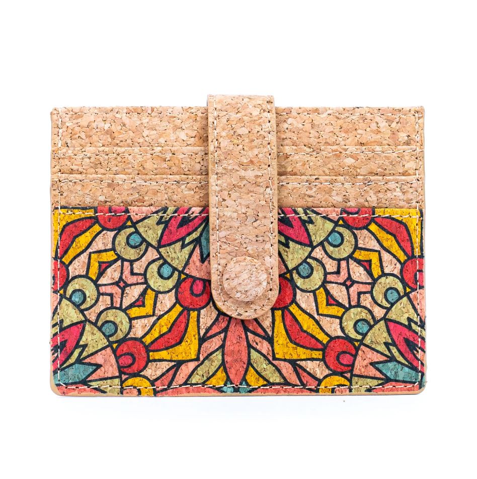 Pungă minimalistă pentru carduri cu un motiv vesel și colorat pe partea din față, oferind în total șapte compartimente: trei pe fiecare parte și unul în mijloc.