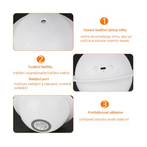 Aceast umidificator are 3 moduri de iluminare: galben cald/alb cald, cu 2 butoane funcționale - butonul de pulverizare și butonul de iluminare, care pot fi comutate oricând.