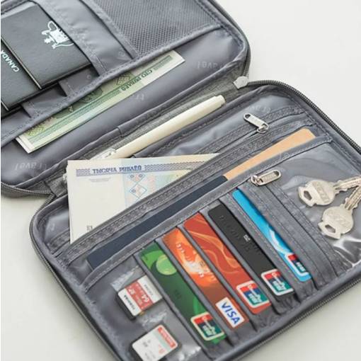 Ambalajul conține o pungă impermeabilă pentru documente și carduri.