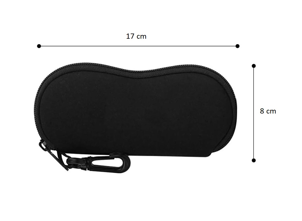 Husă moale din neopren cu închidere tip fermoar și carabină pentru agățare pe rucsac sau geantă, potrivită pentru majoritatea tipurilor de ochelari.