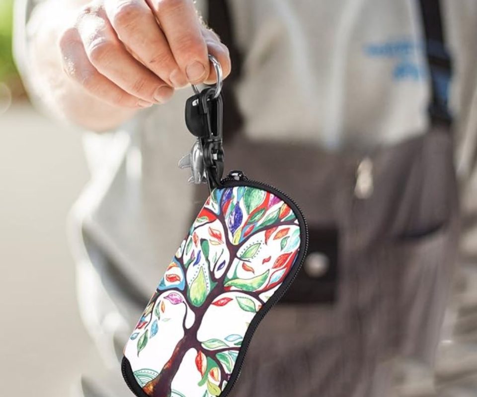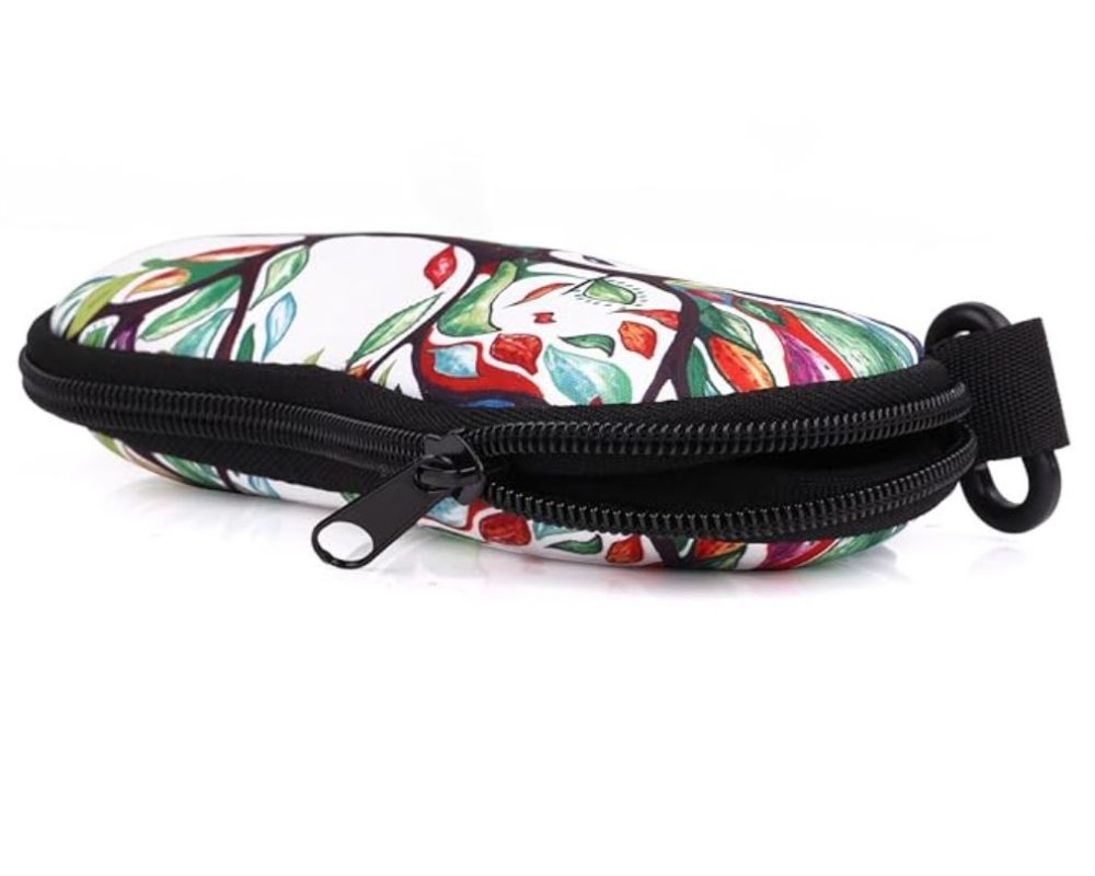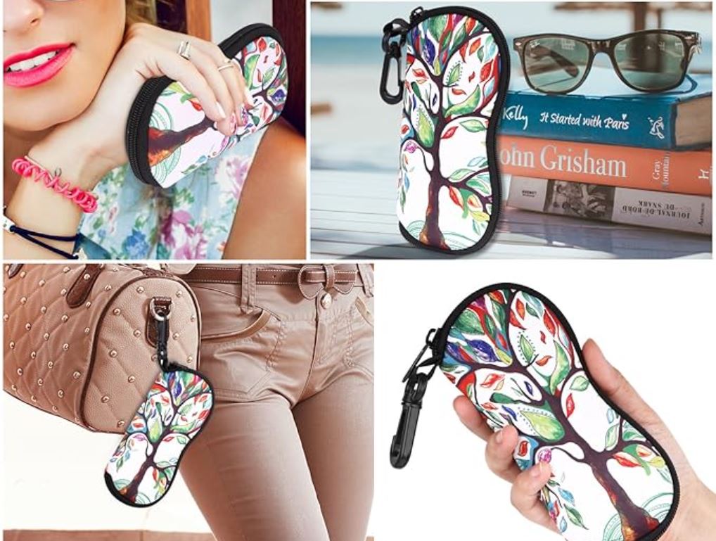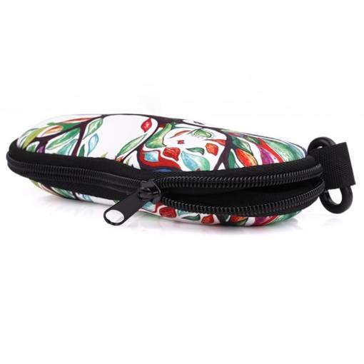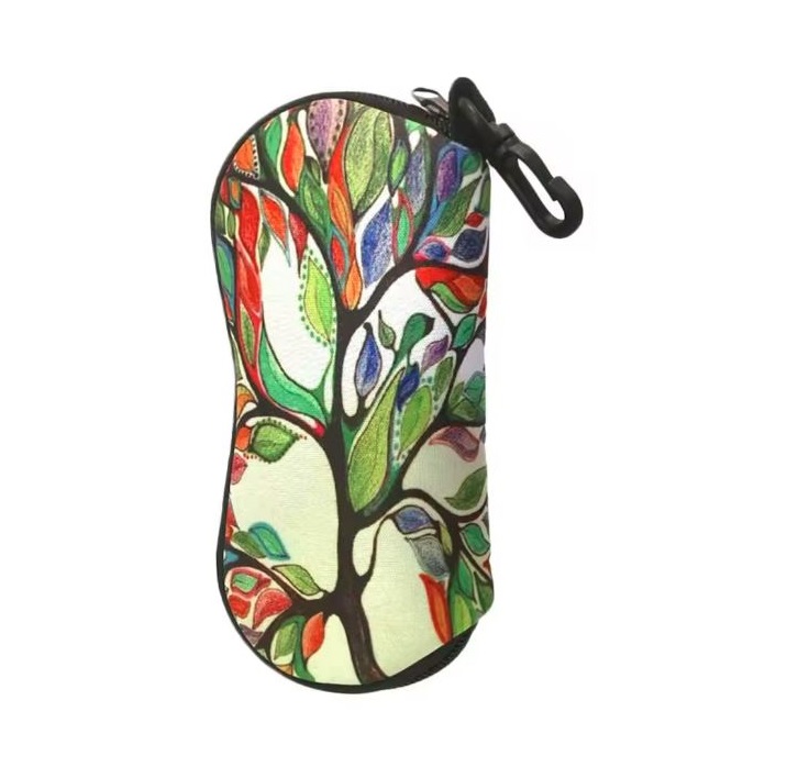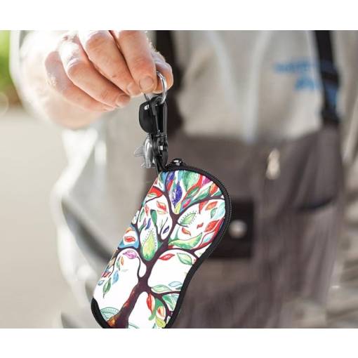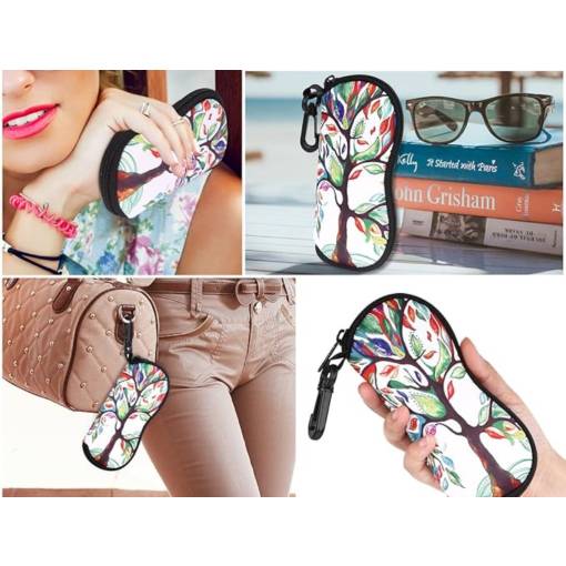 Husă moale din neopren cu închidere tip fermoar și carabină pentru agățare pe rucsac sau geantă, potrivită pentru majoritatea tipurilor de ochelari.