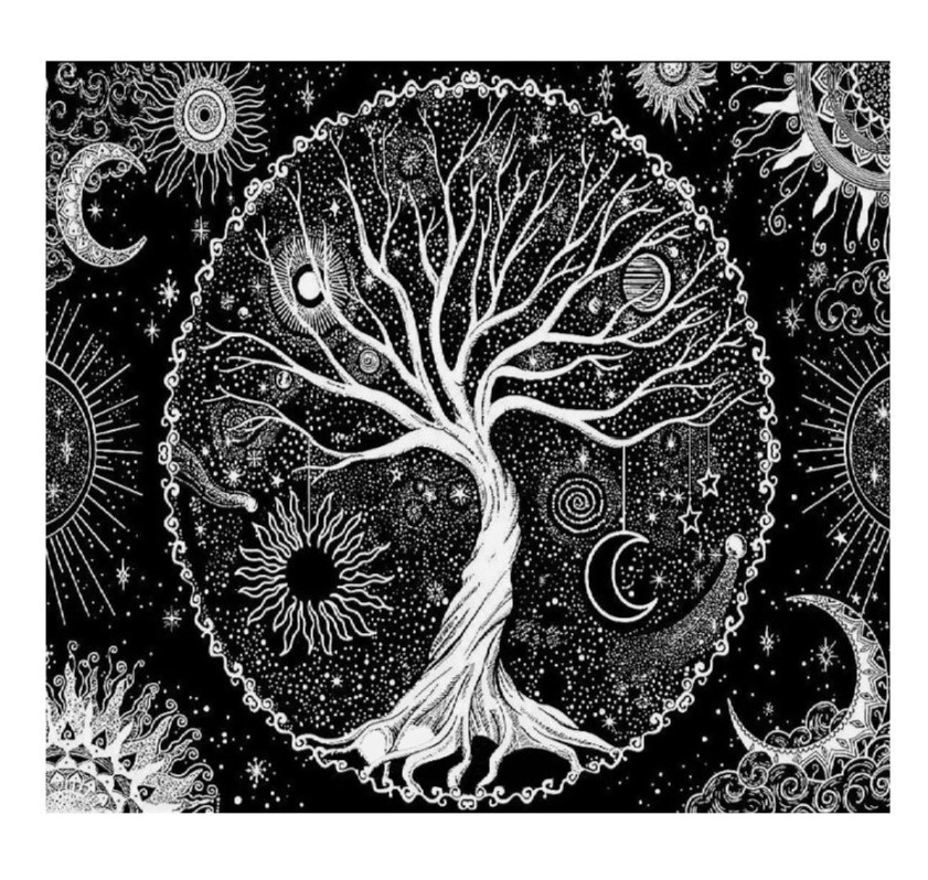 În jurul copacului se află un cerc înconjurat de stele, lună și soare. Acest cerc simbolizează ciclul vieții, tendința și interconectarea tuturor lucrurilor din univers. Stelele și alte corpuri cerești conferă întregului design o atmosferă magică și misterioasă, care invită la meditație și reflecție spirituală.