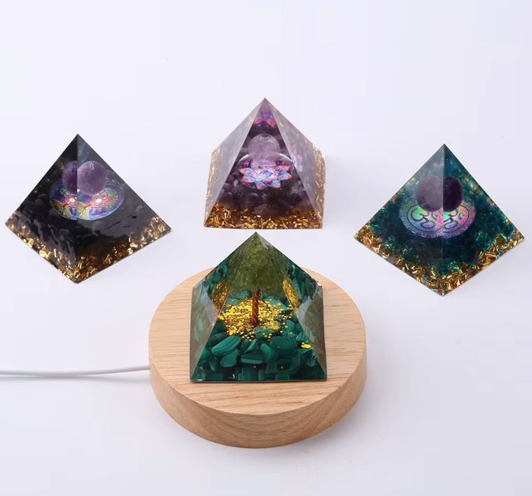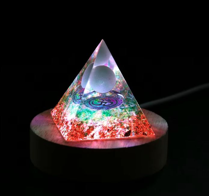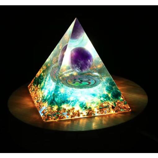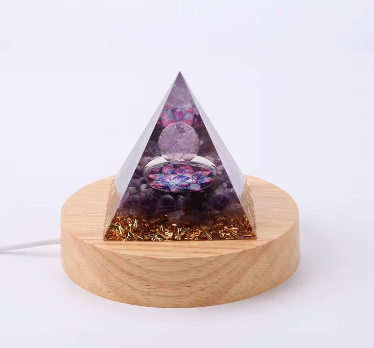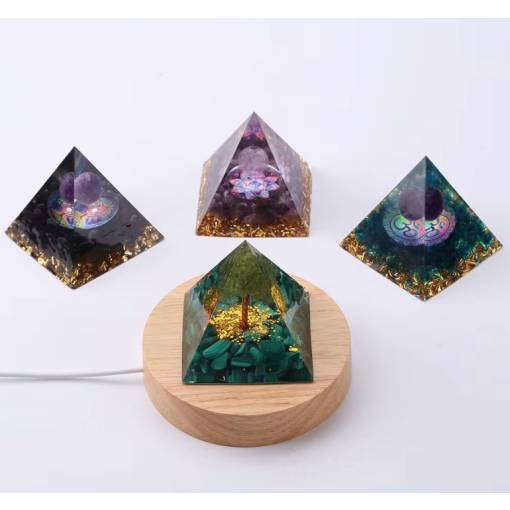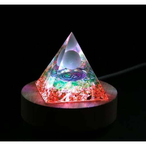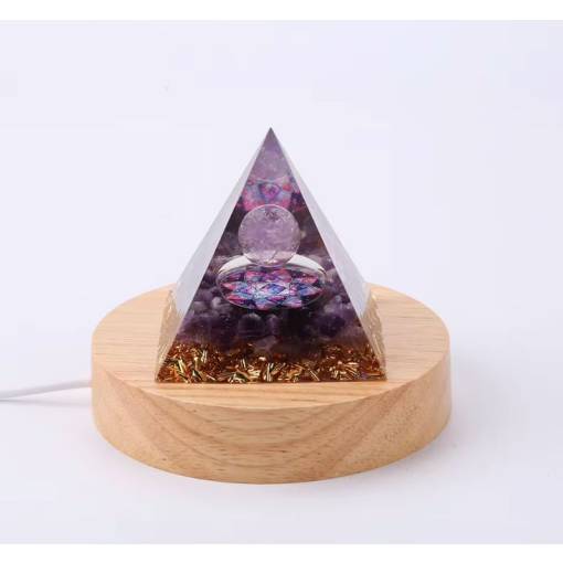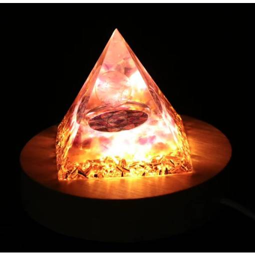Această lumină specială este concepută pentru a sublinia frumusețea și potențialul energetic al organitelor tale. Baza din lemn rotund ascunde iluminarea LED, care luminează fin și eficient piramida, subliniind trăsăturile sale unice.