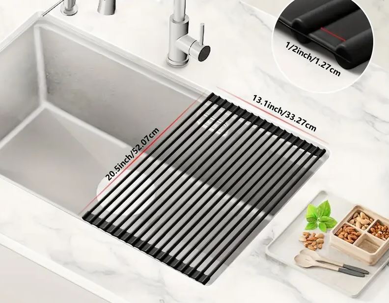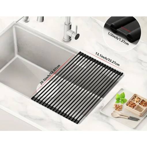 Se rulează ușor, astfel încât nu ocupă aproape deloc spațiu. Datorită dimensiunilor 52 × 33 cm este ideal pentru majoritatea chiuvetelor de bucătărie. Înainte de achiziție, vă recomandăm să măsurați lățimea chiuvetei.