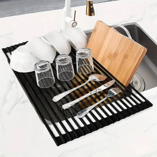 Nu necesită montare complicată – pur și simplu îl așezați pe chiuvetă și după utilizare îl rulați. Suprafața se șterge cu o cârpă sau se clătește. Soluție perfectă pentru gospădăriile mici.