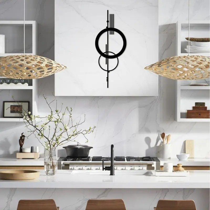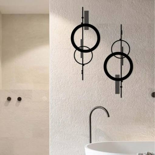Decorație de design modern inspirată de geometrie și armonie a universului. Cercul metalic cu o axă ușor proeminentă creează un element vizual captivant care atrage atenția în orice interior.