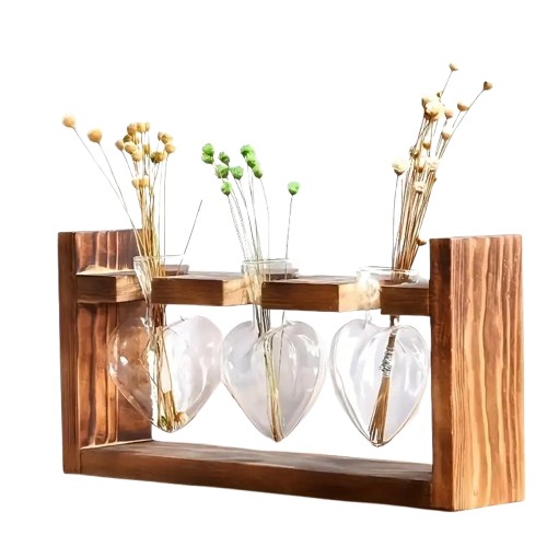 Stativul din lemn cu trei vaze din sticlă este ideal pentru creșterea hidroponică a plantelor, iarba sau ca vaza minimalistă. Vaza din sticlă permite observarea creșterii rădăcinilor, ceea ce adaugă o notă naturală fiecărui interior – perfectă pentru living, birou sau ca dar original.