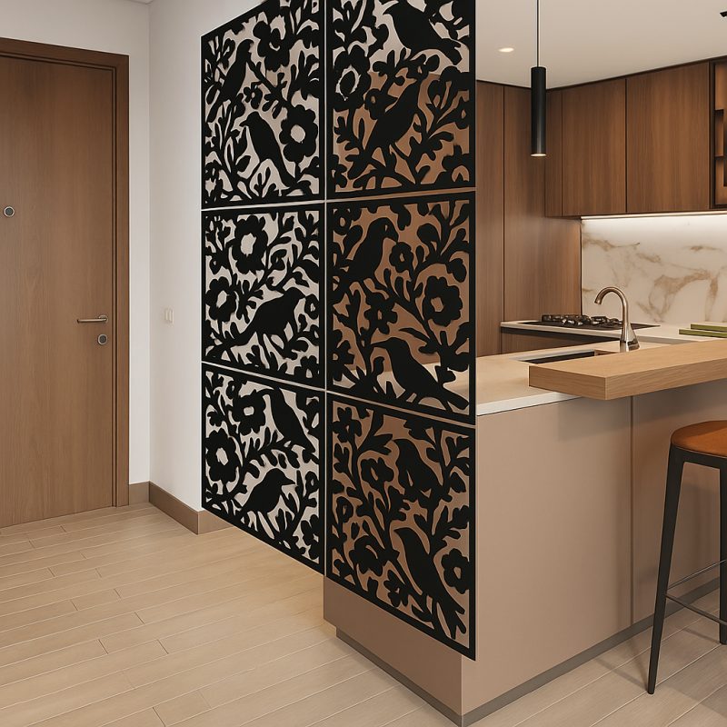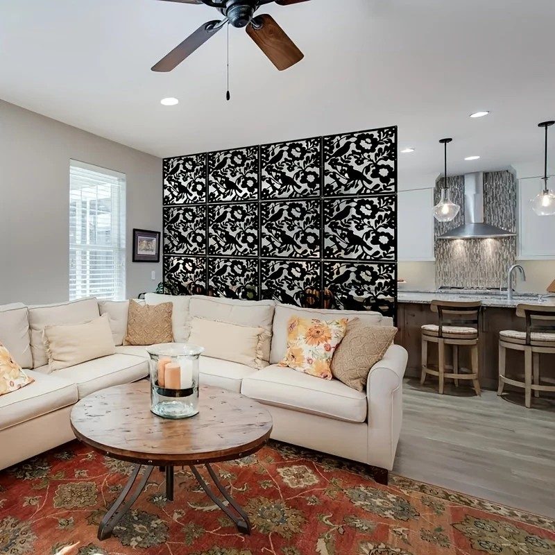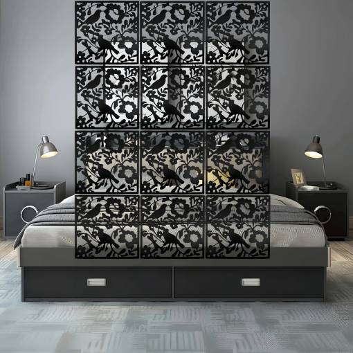 Această panou de perete aduce echilibru și căldură vizuală. Are un aspect elegant, în vreme ce motivele delicate adaugă o notă de natură. Fiecare panou pătrat are o combinație unică de contraste – motive florale și păsări cu fluturi aduc adâncime vizuală în spațiul dumneavoastră. Crează astfel o armonie a minimalismului și a detalii artistice. Ideal pentru iubitorii de stil curat cu o notă de originalitate.