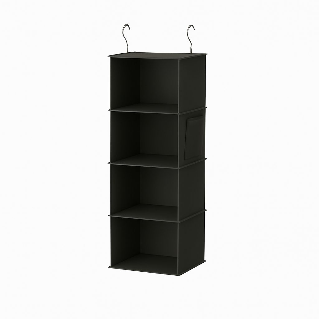 Această cutie suspendată este soluția ideală pentru orice dormitor, cameră de copii sau hol. Este dotată cu patru rafturi spațioase și se agăță ușor cu ajutorul a două cârlige metalice. Datorită materialului robust, își menține forma. Designul oferă un aspect modern și facilitează orientarea printre articole.