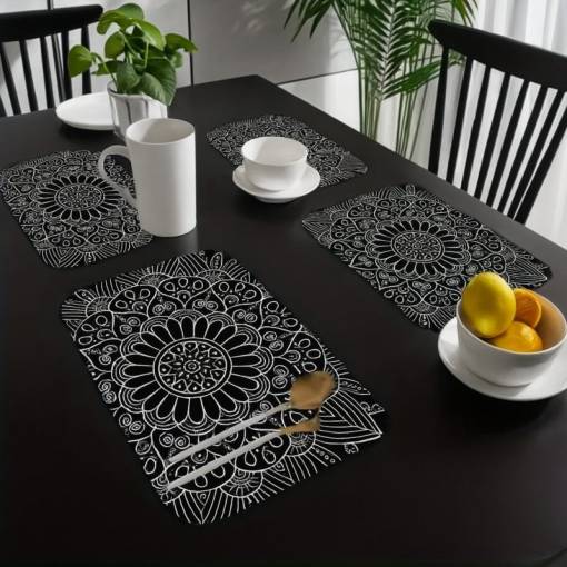 Un covoraș stilat cu un motiv mandala - eleganță alb-neagră pentru masa dumneavoastră.