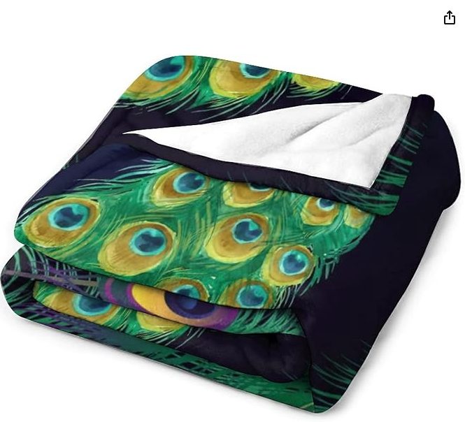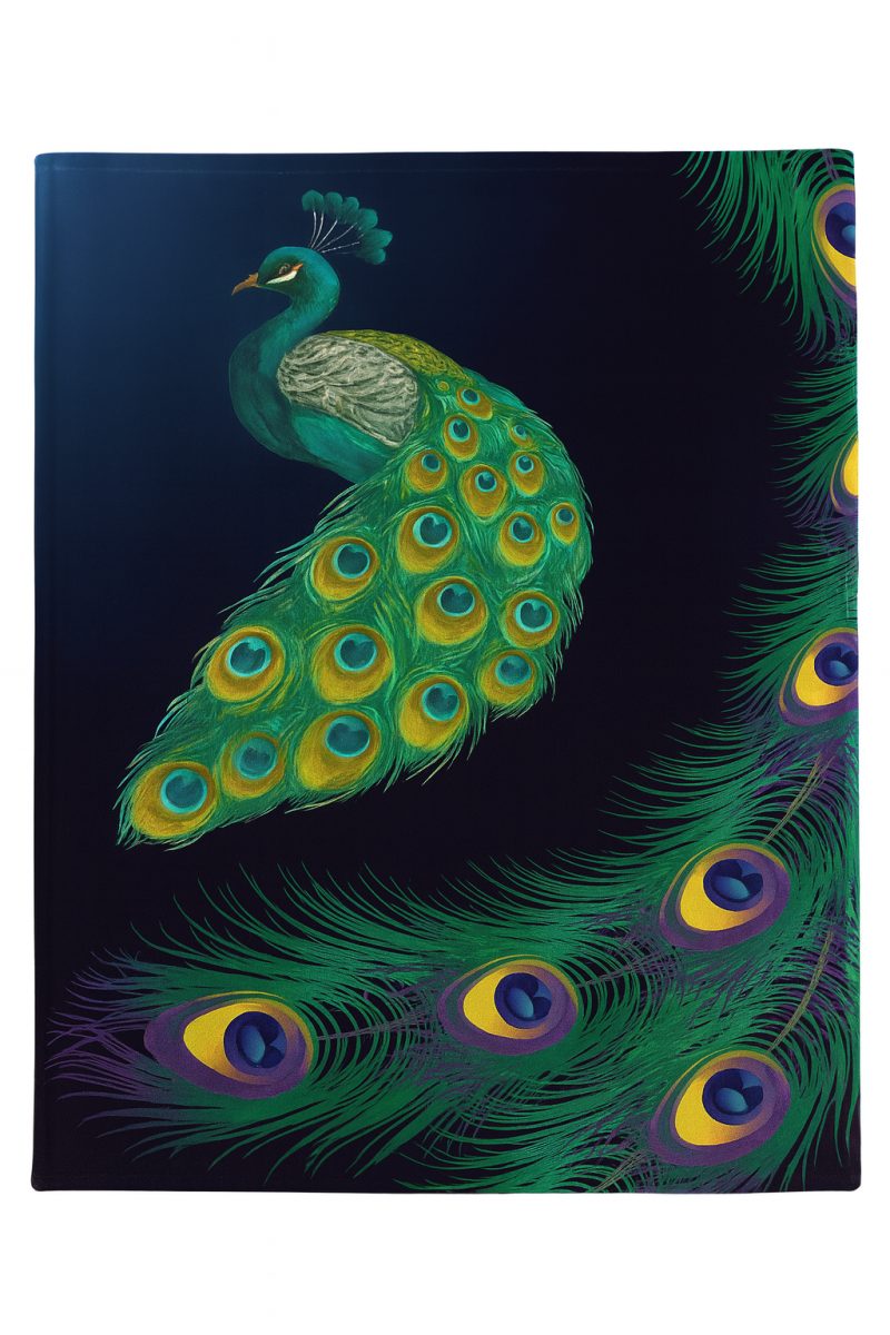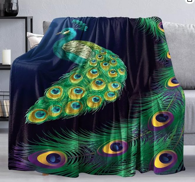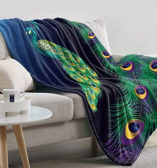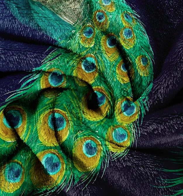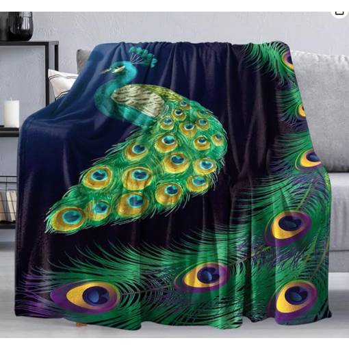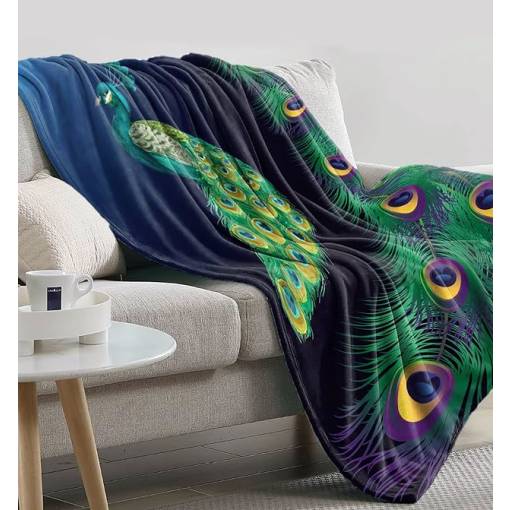 Înfășurați-vă în eleganță cu această pătură moale cu un motiv splendid de păun.