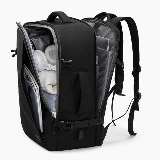 Rucsacul se deschide la 180° ca o valiză – ideal pentru o împachetare ușoară și rapidă și controlul de securitate la aeroport. Curea posterior permite prinderea de mânerul unei valize, manevrarea laterală facilitează transportul ca o geantă. -