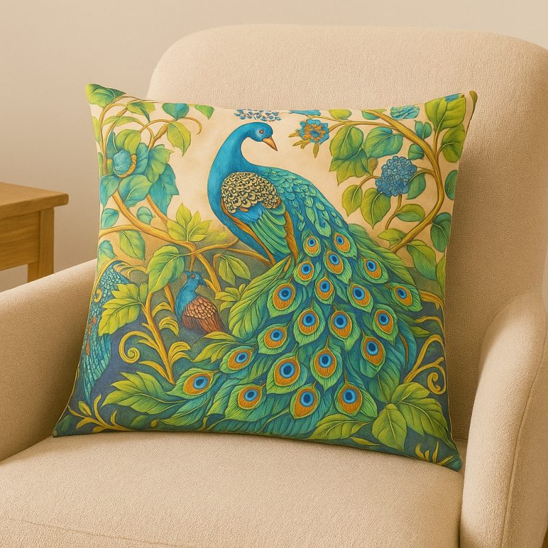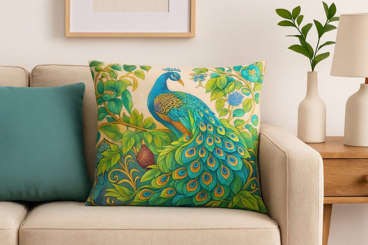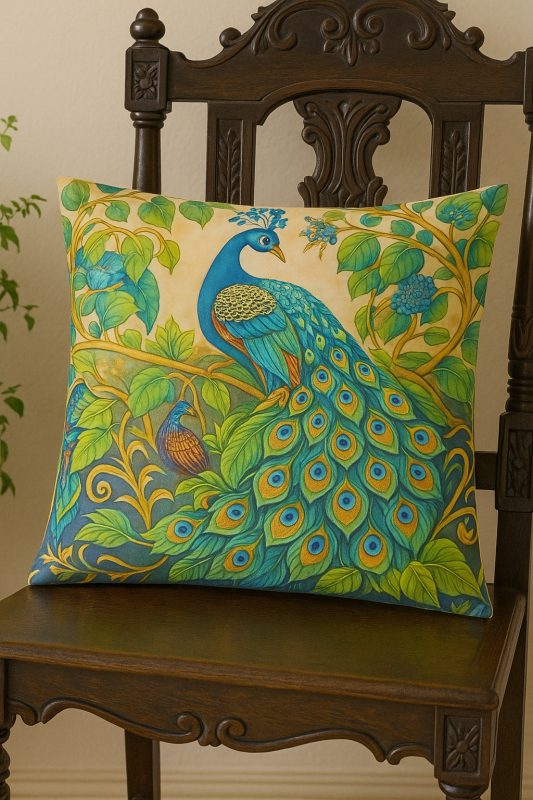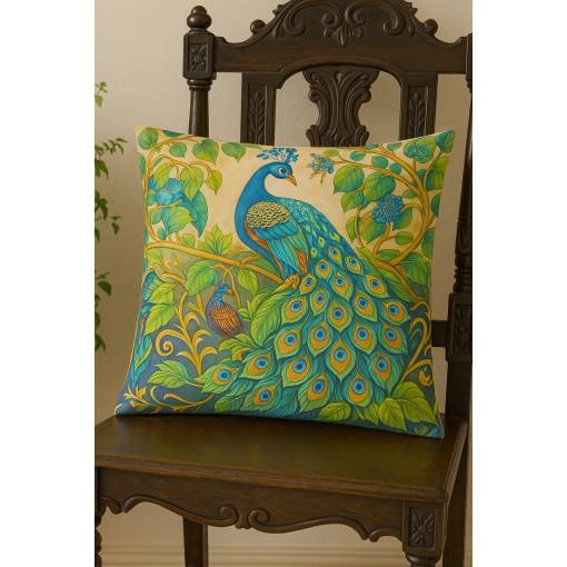 Încărcați-vă casa cu eleganță și farmec exotic cu această frumoasă husă de pernă, pe care păunul majestuos își afișează penele colorate între flori încântătoare. Nuantele bogate de albastru, turcoaz și auriu creează un aspect luxos, care va atrage privirea în orice interior – fie pe un scaun, o canapea sau un pat.
