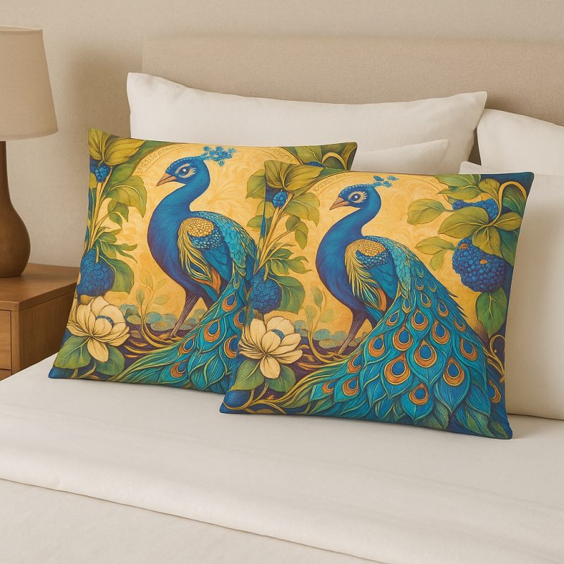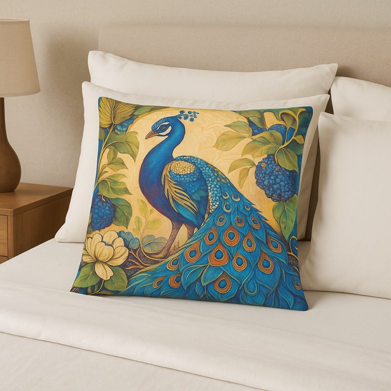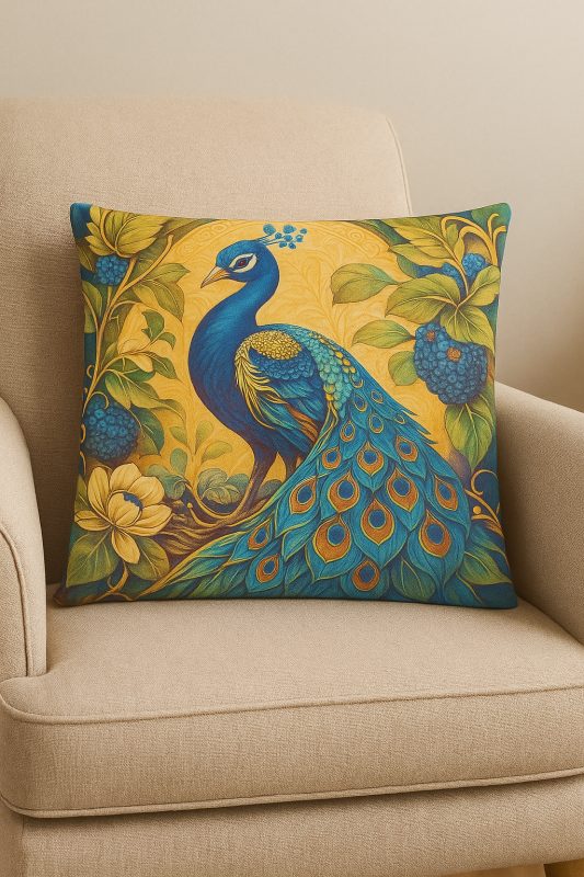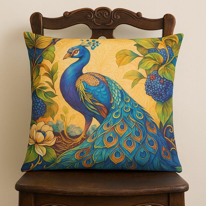 Încărcați-vă casa cu eleganță și farmec exotic cu această frumoasă husă de pernă, pe care păunul majestuos își afișează penele colorate între flori încântătoare. Nuantele bogate de albastru, turcoaz și auriu creează un aspect luxos, care va atrage privirea în orice interior – fie pe un scaun, o canapea sau un pat.