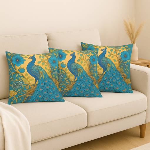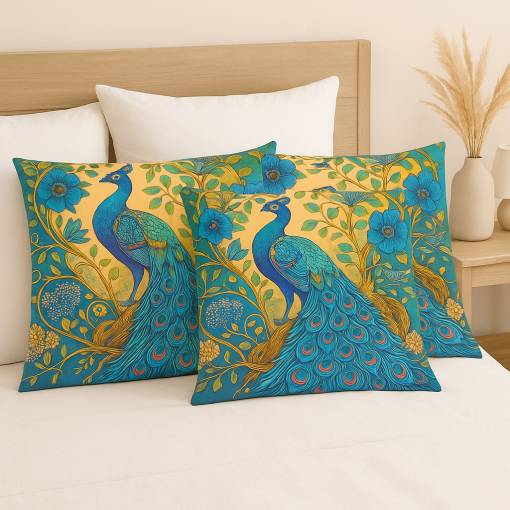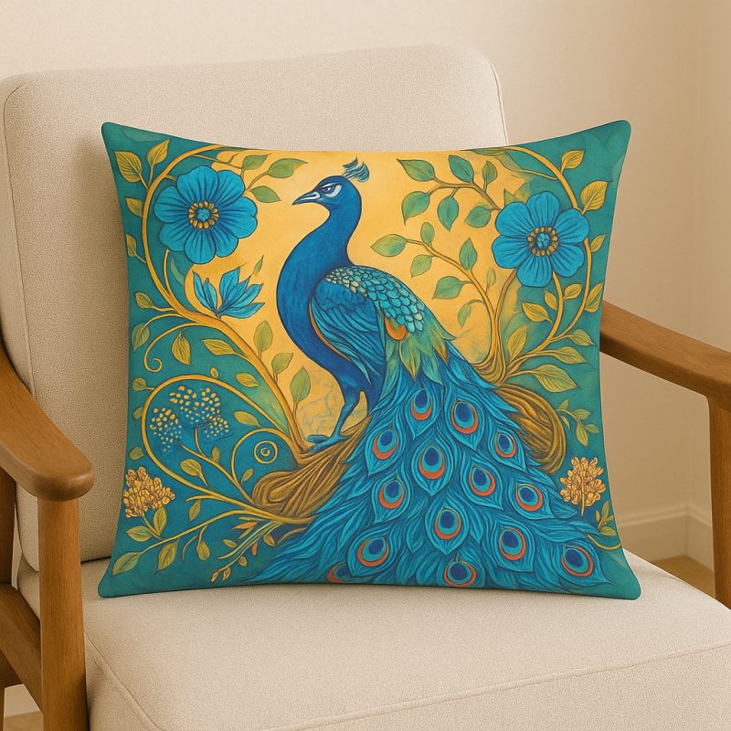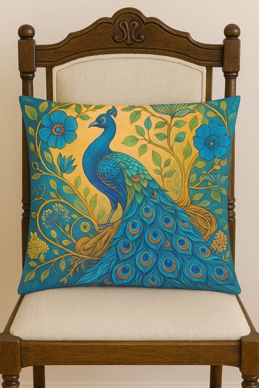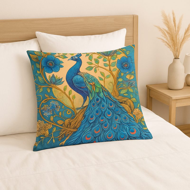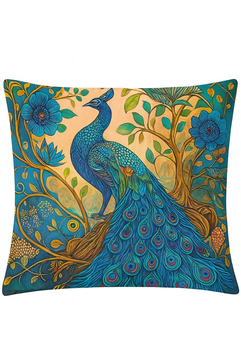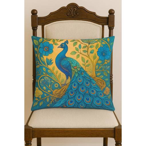 Încărcați-vă casa cu eleganță și farmec exotic cu această frumoasă husă de pernă, pe care păunul majestuos își afișează penele colorate între flori încântătoare. Nuantele bogate de albastru, turcoaz și auriu creează un aspect luxos, care va atrage privirea în orice interior – fie pe un scaun, o canapea sau un pat.